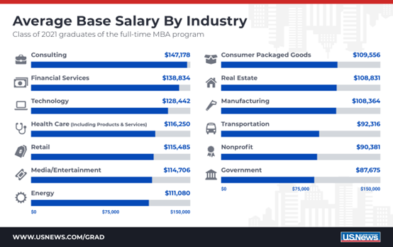 MBA 薪酬不僅取決於畢業生在哪裡獲得學位,還取決於所選擇的行業。平均而言,進入管理顧問行業的MBA畢業生的基本工資最高,而在政府工作的人的基本工資往往最低。U.S. News 數據顯示,在管理顧問行業工作的應屆MBA畢業生的平均工資通常比在政府部門工作的同行高出近 60,000 美元。