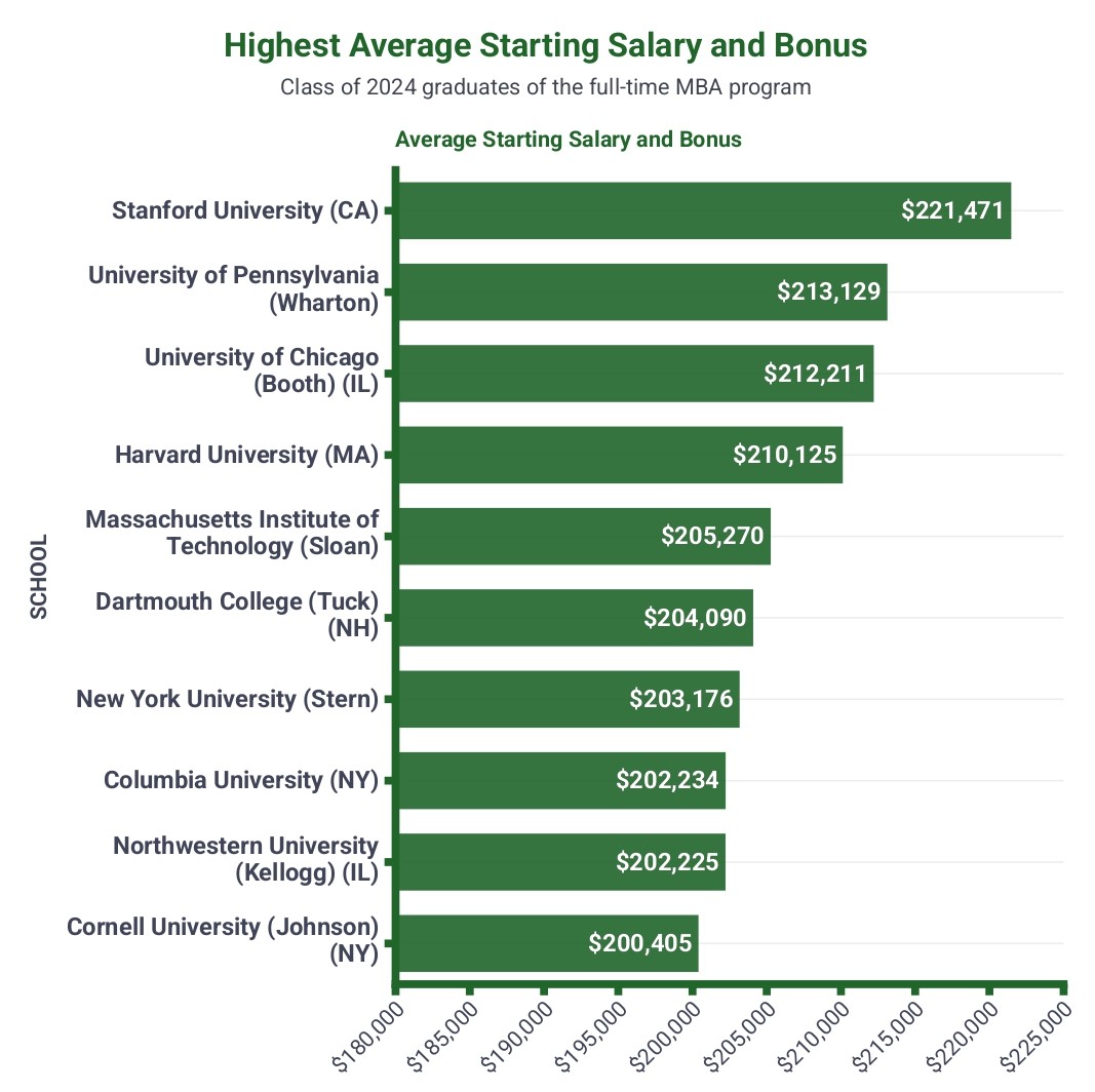 史丹佛大學的商學院2024 MBA畢業生的平均起薪187,504美元最高,在平均起薪前十高的商學院中,平均起薪為170,220美元。賓夕法尼亞大學的華頓商學院平均簽約獎金最高,平均為39,856美元。此外,一些找到工作的MBA畢業生雖無法獲得簽約獎金,如果符合某些要求,通常有資格獲得績效獎金,並且他們也可能會獲得股票期權。