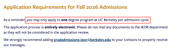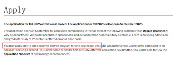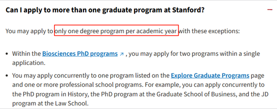 部分美國名校要求申請者在一個申請季只能提交一個program的申請,包括普林斯頓、史丹福、達特茅斯、加州大學柏克萊分校、加州大學洛杉磯分校等。