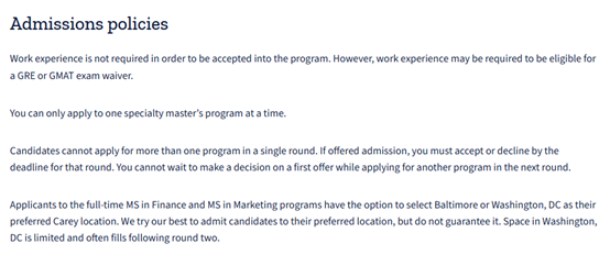 部分學校各學院有獨立的申請系統和規定,代表學校有哈佛大學、耶魯大學、哥倫比亞大學、卡內基美隆大學、約翰霍普金斯大學等。