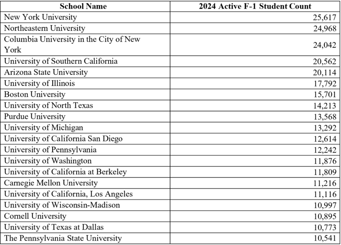 在選校方面,2024年最受F-1學生歡迎的TOP 20大學共招收超過30.3萬國際學生,占總數的19%。全美共有五所高等教育機構註冊國際學生(F-1簽證)數量突破20,000,依次為紐約大學(25,617)、東北大學(24,968)、哥倫比亞大學(24,042)、南加州大學(20,562)、亞利桑那州立大學(20,114),穩居最受國際學生青睞的美國高校行列。此外,名列前20的國際學生友好院校註冊留學生人數都超過了10,000。