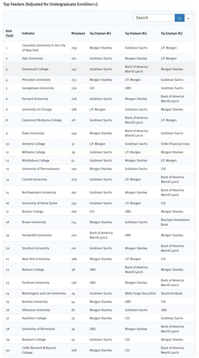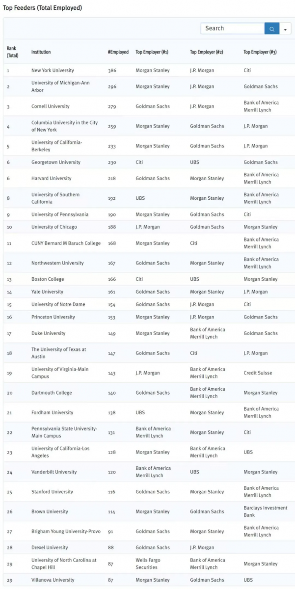 這張榜單直接回答一個問題:在頂級投行的辦公室裡,哪所大學的校友最多?結果不出意外,常春藤盟校、紐約大學、芝加哥大學等老牌名校依舊霸榜。金融圈對名校的偏愛,從來不是秘密。