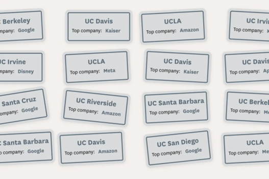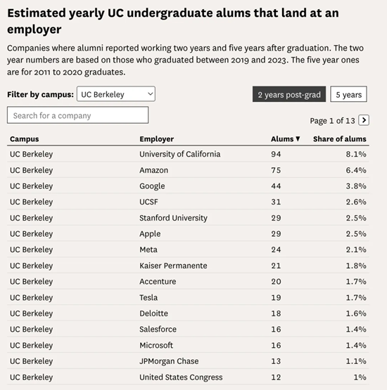 加州大學官方發佈的校友職業發展報告,清晰勾勒出校友們的職業發展地圖。這份報告通過領英等公開平臺採集了校友自主填報的雇主及職位資訊。資料覆蓋加州大學每屆約40%的畢業生,完全可以視為校友就業去向的參照樣本。資料顯示,不少加州大學附近的企業可謂是近水樓臺先得月,挖走了不少校友!比如,加州伯克利大學(UC Berkeley)的人才被灣區的谷歌打包帶走;而聖芭芭拉(Santa Barbara)分校的畢業生,很多都選擇進入家門口的房地產軟體公司AppFolio工作。