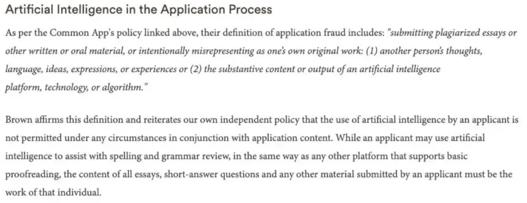 近期布朗大學發佈2025~2026申請季新規:使用 AI 寫文書將被判為申請欺詐,與偽造成績單、偽造推薦信等同屬嚴重違規行為。校方甚至引用了 Common App 對申請欺詐的定義,其中明確提到:提交抄襲或AI生成的內容,冒充原創作品;偽造背景、經歷或推薦信;提供虛假成績單或考試成績。這些行為一旦被發現,可能直接被拒,甚至被列入不誠信黑名單。