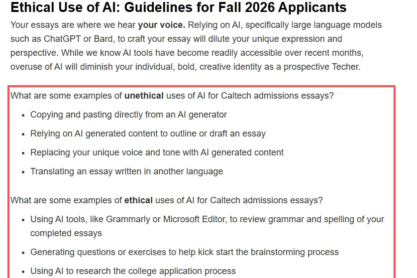 對2026年秋季入學的學生,加州理工也劃了紅線:直接複製粘貼AI內容、用AI寫大綱或草稿、讓AI模仿你的語氣、用AI翻譯文書,統統不行! 只能用它檢查語法、説明腦力激盪、或者做大學資訊研究。