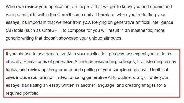 康乃爾大學官網表示:依賴生成式人工智慧(AI)工具(如ChatGPT)為申請者代筆,將導致缺乏個性、過於空泛的寫作,無法展現申請人的獨特特質。康乃爾大學態度是:學生可以符合道德規範的方式使用AI,比如研究大學資訊、腦力激盪、檢查語法,但不允許用AI來列提綱、起草或撰寫文書 。