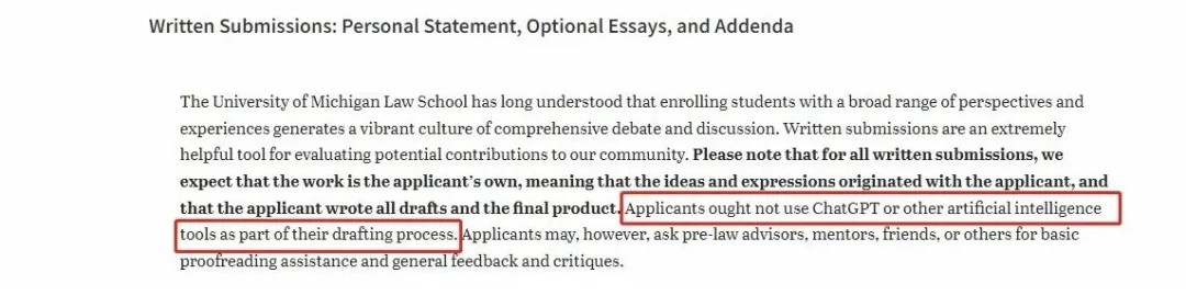 在密西根大學官網中,學校明確要求:所有書面申請材料必須是申請人自己的作品,包括所有草稿和最終版本。不得使用 ChatGPT 或其他生成式 AI 工具參與起草過程,申請人可以使用工具進行語法或拼寫檢查等檢查。